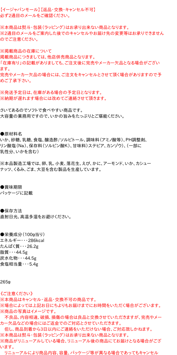 ●原材料名 いか、砂糖、乳糖、食塩、醸造酢/ソルビトール、調味料(アミノ酸等)、PH調整剤、リン酸塩(Na)、保存料(ソルビン酸K)、甘味料)ステビア、カンゾウ)、(一部に乳性分、いかを含む) ※本品製造工場では、卵、乳、小麦、落花生、えび、かに、アーモンド、いか、カシューナッツ、くるみ、ごま、大豆を含む製品を生産しています。